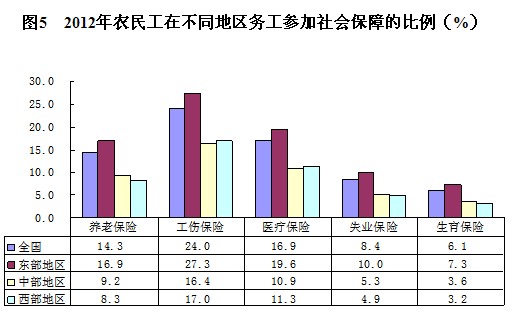 雇主或單位為農民工繳納養老保險、工傷保險、醫療保險、失業保險和生育保險的比例分別為14.3%、24%、16.9%、8.4%和6.1%,分別比上年提高0.4、0.4、0.2、0.4和0.5個百分點。從近五年調查數據看,外出農民工養老保險、醫療保險、失業保險和生育保險的參保率提高4個百分點左右,而“五險”中參保率相對較高的工傷保險沒有明顯提高。