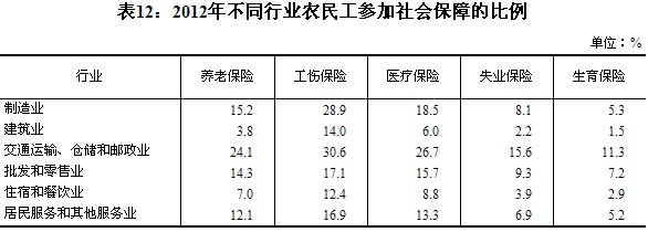 從外出農民工從事的主要行業看,制造業、交通運輸倉儲郵政業、批發零售業和服務業的參保情況相對較好,而建筑行業、住宿餐飲業的農民工,雇主或單位為其繳納各項保險的比例明顯低于其他行業。2012年制造業各項參保比例的提高快于其他各行業。