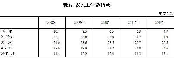 21-30歲占31.9%,31-40歲占22.5%,41-50歲占25.6%,50歲以上的農民工占15.1%。調查資料顯示,40歲以下農民工所占比重逐年下降,由2008年的70%下降到2012年的59.3%,農民工平均年齡也由34歲上升到37.3歲。