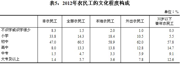在農民工中,文盲占1.5%,小學文化程度占14.3%,初中文化程度占60.5%,高中文化程度占13.3%,中專及以上文化程度占10.4%。外出農民工和年輕農民工中高中及以上文化程度分別占26.5%和36.4%。外出農民工的受教育水平高于本地農民工,農民工受教育水平又明顯高于非農民工。與上年相比,30歲以下年輕農民工組高中及以上文化程度比重增加2.4個百分點,明顯高于其他組農民工。