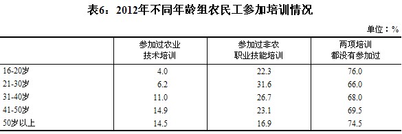 在農民工中,接受過農業技術培訓的占10.7%,接受過非農職業技能培訓的占25.6%,既沒有參加農業技術培訓也沒有參加非農職業技能培訓的農民工占69.2%。青年農民工接受非農職業技能培訓的比例要高于年長的農民工,年長的農民工接受農業技術培訓的比例要高于青年農民工,年齡層次越低,接受農業技術培訓的比例也越低。