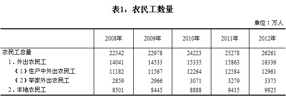 據抽樣調查結果推算,2012年全國農民工總量達到26261