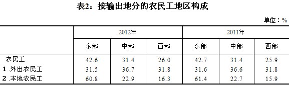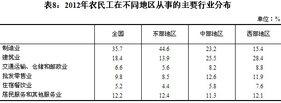 從農民工的就業地區來看,2012年在東部地區務工的農民工16980萬人,比上年增加443萬人,增長2.7%,占農民工總量的64.7%,比上年降低0.7個百分點;在中部地區務工的農民工4706萬人,比上年增加268萬人,增長6.0%,占農民工總量的17.9%,比上年提高0.3個百分點;在西部地區務工的農民工4479萬人,比上年增加263萬人,增長6.2%,占農民工總量的17.1%,比上年提高0.4個百分點。