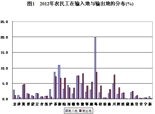 東部地區包括北京、天津、河北、遼寧、上海、江蘇、浙江、福建、山東、廣東、海南11個省(市);中部地區包括山西、吉林、黑龍江、安徽、江西、河南、湖北、湖南8個省;西部地區包括內蒙古、廣西、重慶、四川、貴州、云南、西藏、陜西、甘肅、青海、寧夏、新疆12個省(市、自治區)。農民工的就業地區分布,除東部、中部和西部地區外,另有0.3%的外出農民工在港澳臺地區及國外從業。