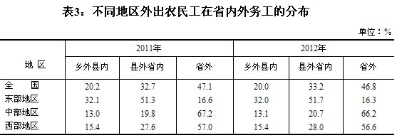 分地區看,東部地區83.7%的外出農民工省內流動,其中在鄉外縣內占32%,縣外省內占51.7%,跨省流動的僅占16.3%。中、西部地區外出農民工則是以跨省流動為主,分別占66.2%和56.6%。