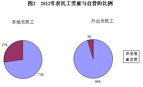 在外出農民工中,受雇人員占95.3%,自營人員占4.7%;在本地農民工中,受雇人員占72.8%,自營人員占27.2%。自營人員主要從事批發零售業,占38.9%;其次是從事交通運輸業倉儲和郵政業占19.3%,從事制造業占11.9%,從事服務業占11.2%。外出農民工和本地農民工中自營人員所占比重繼續呈下降趨勢,本地自營和外出自營分別比上年低0.9和0.5個百分點。