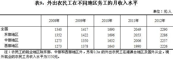 2012年末,外出農民工人均月收入水平為2290元,比上年提高241元,增長11.8%,但增加額比上年同期減少118元,增幅回落9.4個百分點。分地區看,在東部地區務工的農民工月收入水平為2286元,比上年增加233元,增長11.4%;在中部地區務工的農民工月收入水平為2257元,比上年增加251元,增長12.5%;在西部地區務工的農民工月收入水平為2226元,比上年增加236元,增長11.8%。另外,在境外就業的農民工月收入水平為5550元。