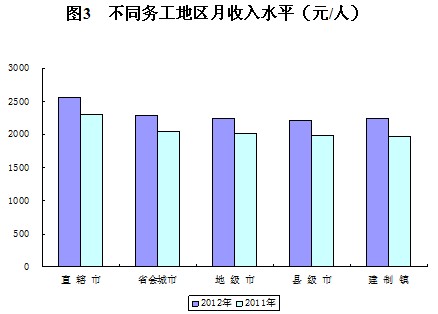 從外出農民工的從業地點看,在直轄市務工的農民工人均月收入水平2561元,比上年增加259元;在省會城市務工的農民工月收入水平2277元,增加236元;在地級市和縣級市務工的農民工月收入水平分別為2240元和2204元,分別增加229元和222元。大城市的務工收入水平和增加額都要高于中小城市的水平。