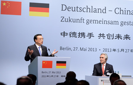 國務院總理李克強27日在柏林出席中德工商界午餐會并發表演講,介紹了中國經濟形勢和中國新一屆政府的經濟政策,提出深化中德、中歐合作的新主張。 李克強說,今天上午,德國政府向歐盟表明,德國反對對中國無線通信設備產品實施“雙反”調查。我對此表示贊賞。中歐應通過對話協商妥善解決貿易摩擦。反對貿易保護主義是克服困難、實現復蘇的良藥。