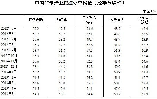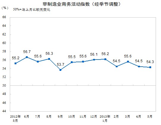 2013年5月,中國非制造業商務活動指數為54.3%,比上月回落0.2個百分點。