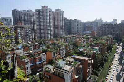 成都市南邊某小區樓頂戶戶都有屋頂花園。屋頂花園成為成都市居民樓一大亮點。