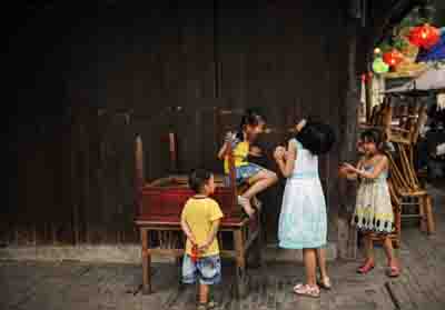 孩子們在安仁古鎮的街邊玩耍。