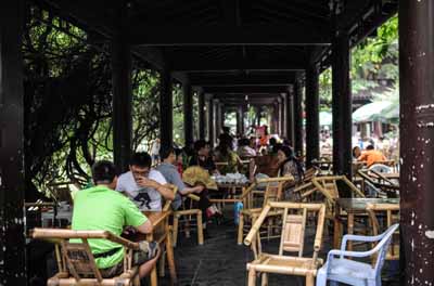 市民在成都市人民公園的長廊內品茶聊天。