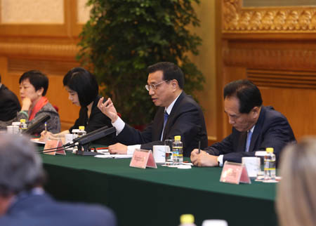 6月5日,國務院總理李克強在人民大會堂同出席2013財富全球論壇和出席全球首席執行官委員會的企業家代表會見并座談。 李克強說,在世界市場持續低迷、經濟復蘇艱難曲折的背景下,中國工業化、城鎮化進程將帶來巨大需求。他勉勵在座企業家抓住中國發展帶來的巨大機遇,拓展合作共贏的新途徑。