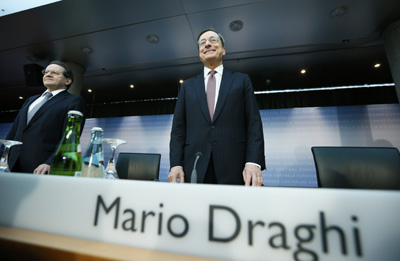 歐洲央行6日宣布維持基準利率0.5%不變。歐洲央行行長德拉吉(右)在發布會上指出,歐洲央行已做好采取進一步行動的準備,并將密切關注歐元區的經濟和金融發展。