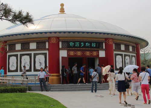 鄂爾多斯展園位于園博園西南側,總占地面積8400平方米,面對北京主展館,臨近上海園、合肥園和唐山園,是位置最突出、面積最大、內容最豐富的展園之一。展園以蒙元文化和草原文化為基調,突出鄂爾多斯特有的地域性、民族性和多元性,整體布局充分利用原有地勢,結合周邊場館環境,形成大開大合、高低錯落、疏朗有致的園林風格。展園植物選擇鄉土樹種二十八種,主要包括家榆、旱柳、紅柳、沙柳、沙棗、沙地柏、檸條、馬藺等,都是耐旱、耐寒、耐瘠薄的優選植物。園內主體建筑由一個鋼結構蒙古包、一個氈包和一個原生態敖包組成,三個圓形建筑各具特色,相互呼應,以開放熱情的姿態迎接四面八方來客。主館鄂爾多斯館建筑面積320平米,外立面藍白相間、雕欞映襯,館內展陳結合、聲光互補,集中展示鄂爾多斯城市園林綠化建設成果和經濟社會文化各項事業發展成就。