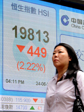 美聯儲表態逐步退出量化寬松,中國驟然出現“錢荒”,日本央行稱不會用“彈藥”救市,多重因素導致亞太主要股市周一大跌,日本日經指數、香港恒生指數、韓國綜合指數、新加坡海峽時報指數、澳大利亞S&P/ASX200指數分別下跌1.26%、2.22%、1.31%、1.2%、1.6%。 圖為一行人24日從香港中環一家銀行的恒生指數電子顯示屏前走過。