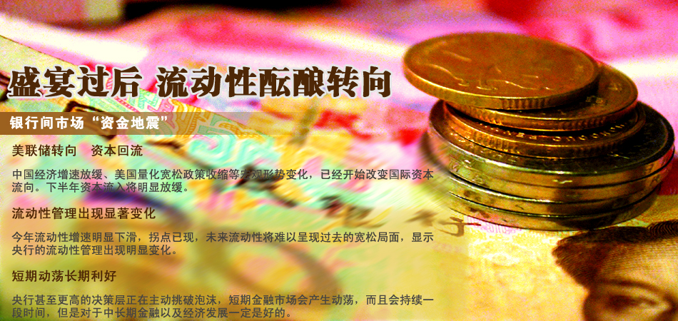 6月以來,銀行間市場資金陡然緊俏,Shibor一再飆升。6月6日,農發債因認購不足而流標,市場傳出兩股份制銀行資金頭寸告急。6月7日,央行取消了SLO操作。當天下午,兩國有大行4點半左右同時向市場借錢。6月8日,隔夜Shibor利率升至9.5810%。