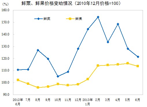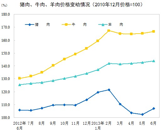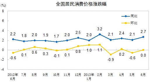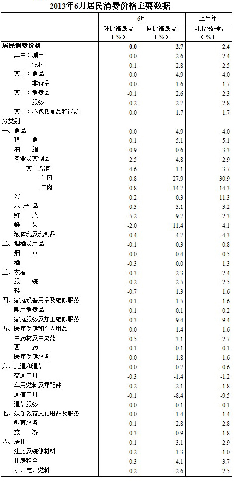 2013年6月份,全國居民消費價格總水平同比上漲2.7%(創4個月新高)。其中,城市上漲2.6%,農村上漲2.8%;食品價格上漲4.9%,非食品價格上漲1.6%;消費品價格上漲2.6%,服務價格上漲2.7%。上半年,全國居民消費價格總水平比去年同期上漲2.4%。