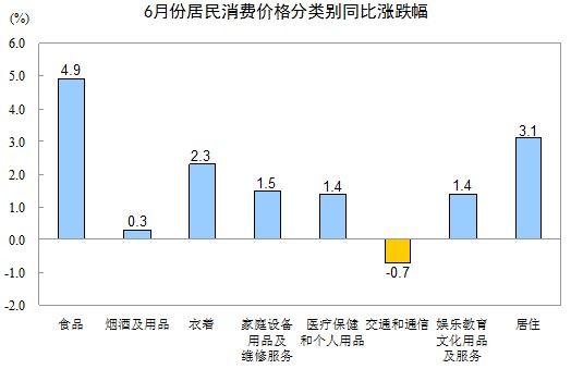 6月份,食品價格同比上漲4.9%,影響居民消費價格總水平同比上漲約1.59個百分點。其中,肉禽及其制品價格上漲4.8%,影響居民消費價格總水平上漲約0.34個百分點(豬肉價格上漲1.1%,影響居民消費價格總水平上漲約0.03個百分點);鮮菜價格上漲9.7%,影響居民消費價格總水平上漲約0.26個百分點;鮮果價格上漲11.4%,影響居民消費價格總水平上漲約0.22個百分點;糧食價格上漲5.1%,影響居民消費價格總水平上漲約0.15個百分點;水產品價格上漲3.1%,影響居民消費價格總水平上漲約0.08個百分點。