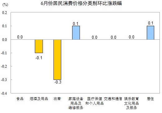 6月份,全國居民消費價格總水平環比持平(漲跌幅度為0,下同)。其中,城市持平,農村上漲0.1%;食品和非食品價格均持平;消費品價格下降0.1%,服務價格上漲0.2%。