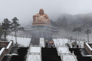 到奉化旅游,一般都要到雪竇山看看彌勒大佛。大佛位于奉化市溪口鎮的雪竇山后山海拔369米山坡上,坐北朝南,左手提布袋,右手握佛珠,慈眉善目,袒胸露腹,笑容可掬。這是以奉化布袋和尚基本形態為造型的中國化彌勒佛像。大佛居高臨下,與整個巖體連成一體,扎實堅固,穩如磐石,宏偉壯觀,氣勢非凡,寶相莊重,做工精美,栩栩如生。