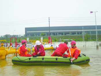 四川遭受50年一遇洪災,中國石油在川企業積極抗洪,力保油不斷氣不停,生產受控供應平穩。圖為西南油氣田公司輸氣處仁壽作業區員工劃著橡皮艇開展生產自救。