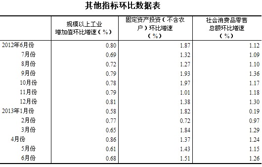 (2)根據季節調整模型自動修正結果,對近一年來各期GDP、規模以上工業增加值、固定資產投資(不含農戶)、社會消費品零售總額環比增速進行修訂。修訂結果及2013年二季度GDP環比數據、2013年6月份其他指標環比數據如下:
