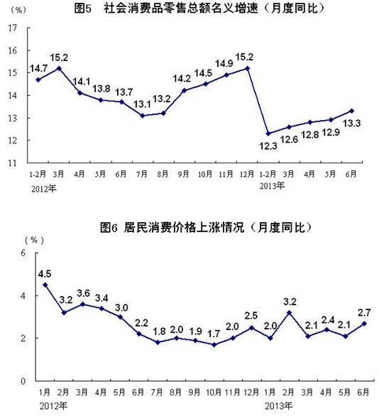 上半年,社會消費品零售總額110764億元,同比名義增長12.7%(扣除價格因素實際增長11.4%),增速比一季度加快0.3個百分點,比上年同期回落1.7個百分點。其中,限額以上企業(單位)消費品零售額55251億元,同比增長10.5%。按經營單位所在地分,城鎮消費品零售額95789億元,同比增長12.5%;鄉村消費品零售額14975億元,增長14.3%。按消費形態分,餐飲收入11795億元,同比增長8.7%,增速比一季度加快0.2個百分點,比上年同期回落4.5個百分點;商品零售98969億元,增長13.2%,比一季度加快0.3個百分點,比上年同期回落1.3個百分點。在商品零售中,限額以上企業(單位)商品零售額51508億元,增長11.7%。其中,汽車類增長8.8%,增速比上年同期回落0.3個百分點;家具類增長21.3%,比上年同期回落3.8個百分點;家用電器和音像器材類增長15.3%,比上年同期加快12.0個百分點。6月份,社會消費品零售總額同比名義增長13.3%(扣除價格因素實際增長11.7%),環比增長1.26%。