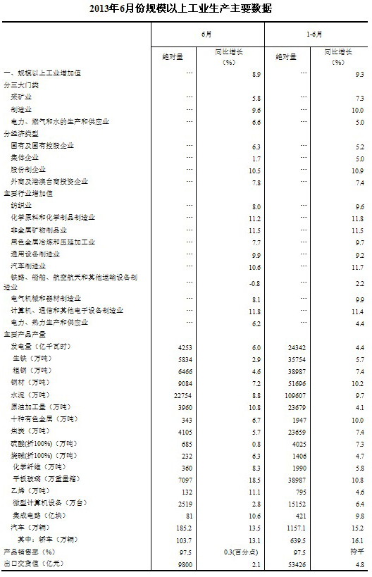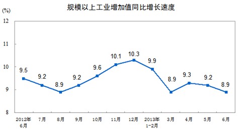 2013年6月份,規模以上工業增加值同比實際增長8.9