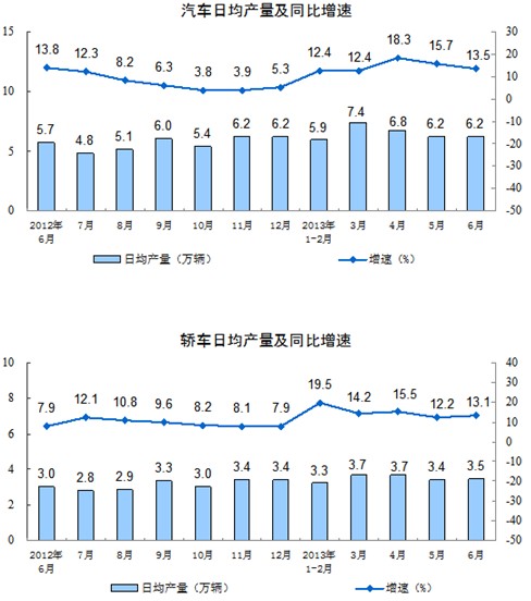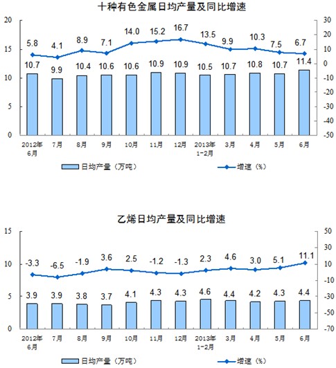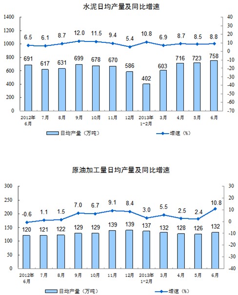 分產品看,6月份,464種產品中有310種產品同比增長。其中,發電量4253億千瓦時,同比增長6.0%;鋼材9084萬噸,增長7.2%;水泥22754萬噸,增長8.8%;原油加工量3960萬噸,增長10.8%;十種有色金屬343萬噸,增長6.7%;乙烯132萬噸,增長11.1%;汽車185.2萬輛,增長13.5%;轎車103.7萬輛,增長13.1%。