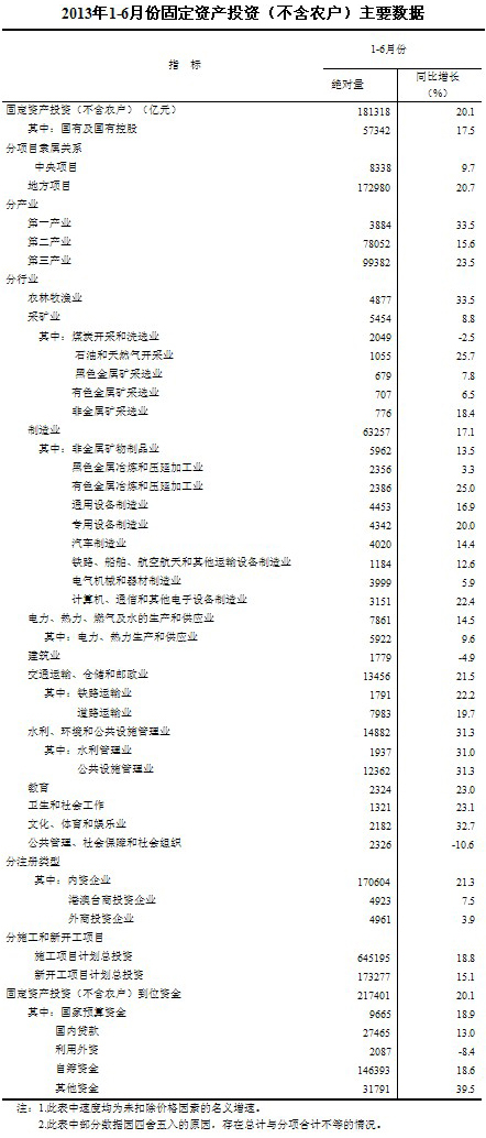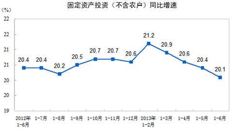 2013年1-6月份,全國固定資產投資(不含農戶)181318億元,同比名義增長20.1%(扣除價格因素實際增長20.1%),增速比1-5月份回落0.3個百分點。從環比看,6月份固定資產投資(不含農戶)增長1.51%。