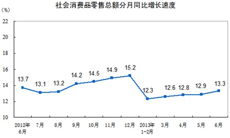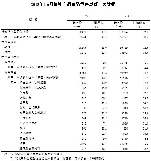 2013年6月份,社會消費品零售總額18827億元,同比名義增長13.3%(扣除價格因素實際增長11.7%,以下除特殊說明外均為名義增長)。其中,限額以上企業(單位)消費品零售額9764億元,增長11.5%。1-6月份,社會消費品零售總額110764億元,同比增長12.7%。