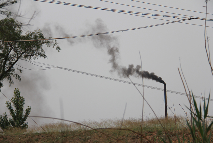 在這家工廠旁邊的麥地旁邊,一個身穿紅白條T恤的廠房巡邏者指著煙囪說,這是一家煉銅煉鋁廠,這幾天上面查得緊,排的黑煙還不算多,要是在往常,那黑煙濃得沒法說。正說話間,工廠車間里還不斷噴出“蘑菇云”似的濃煙,一股腦兒向外圍擴散。