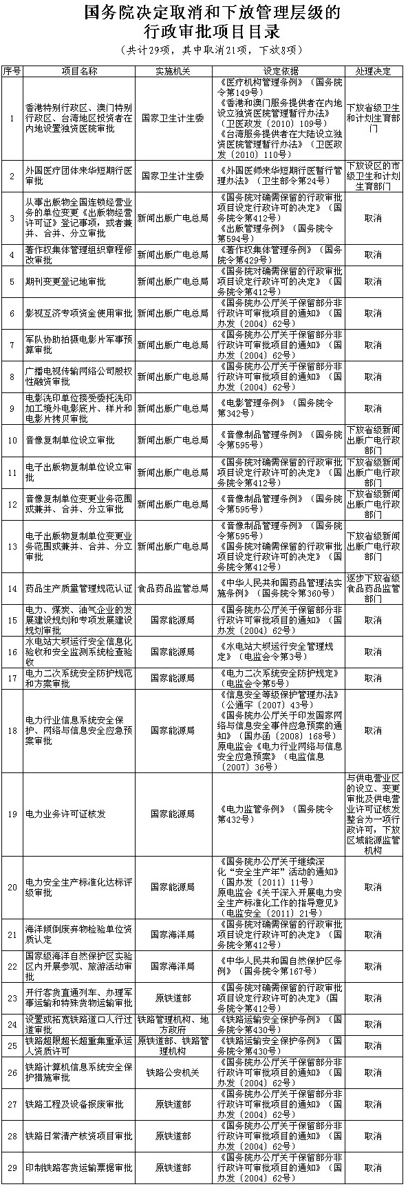 附件:1.國務院決定取消和下放管理層級的行政審批項目目錄(共計29項)