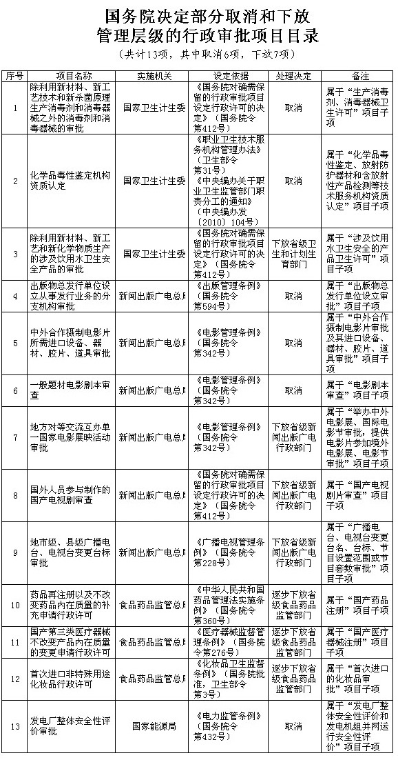 2.國務院決定部分取消和下放管理層級的行政審批項目目錄(共計13項)