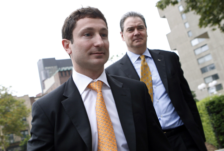 22日,前高盛集團交易員法布里·圖雷(左)在律師陪伴下到達紐約曼哈頓聯邦法庭,準備出庭受審。美國證券交易委員會起訴圖雷在2007年高盛發售的一款合成債務抵押證券中誤導投資者,遺漏關鍵信息并對產品作出錯誤陳述。被稱為“神奇的法布里”的圖雷在這筆名為Abacus 2007-AC1的金融衍生產品上最后令投資者損失10多億美元。