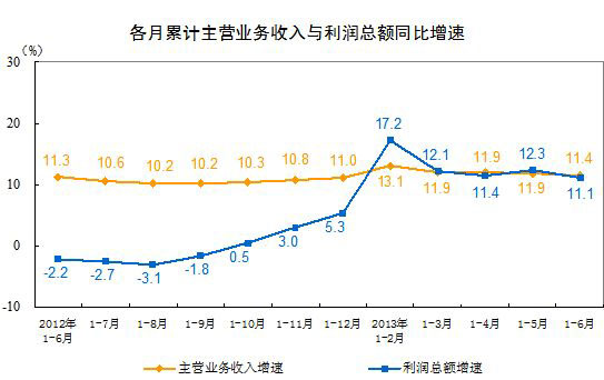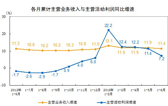 6月份,規模以上工業企業實現利潤總額5024.2億元,比去年同期增長6.3%,其中,主營活動利潤4768.9億元,比去年同期下降2.3%,而5月份主營活動利潤比去年同期增長8.8%。