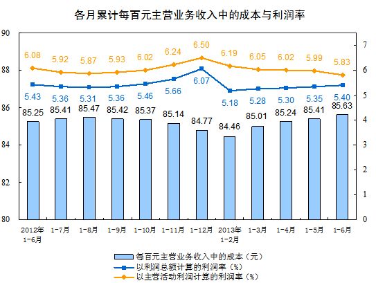 1-6月份,規模以上工業企業實現主營業務收入478365.4億元,比去年同期增長11.4%。每百元主營業務收入中的成本為85.63元,以利潤總額計算的利潤率為5.4%,以主營活動利潤計算的利潤率為5.83%。