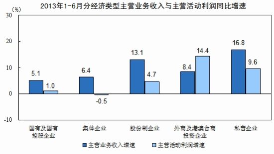 1-6月份,在規模以上工業企業中,國有及國有控股企業實現利潤總額7287.7億元,比去年同期增長4.8%,其中,主營活動利潤6426.7億元,比去年同期增長1%;集體企業實現利潤總額368億元,增長1.2%,其中,主營活動利潤433.4億元,下降0.5%;股份制企業實現利潤總額15091.2億元,增長9.1%,其中,主營活動利潤16526.2億元,增長4.7%;外商及港澳臺商投資企業實現利潤總額5983.9億元,增長14.8%,其中,主營活動利潤5964.8億元,增長14.4%;私營企業實現利潤總額7999.4億元,增長15.8%,其中,主營活動利潤10134.9億元,增長9.6%。