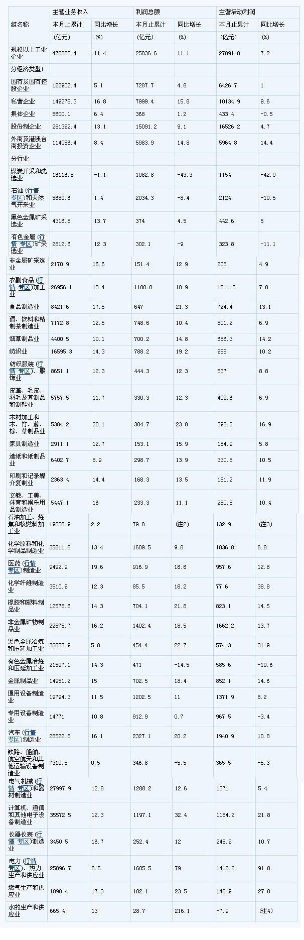 (注:從2013年5月起,在利潤總額下增加“主營活動利潤”指標,主營活動利潤=主營業務收入-主營業務成本-主營業務稅金及附加-銷售費用-管理費用-財務費用。主營活動利潤指標和工業生產的關系更加密切,可以更好地反映企業進行工業生產活動的經營成果。)