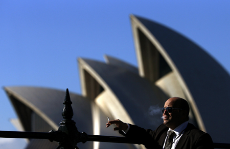 澳大利亞國庫部長克里斯·鮑恩與衛生和醫學研究部長塔尼婭·普利伯塞克1日共同發表聲明,宣布澳大利亞將在未來4年內每年將煙草稅提高12.5%,用于治療與煙草相關的癌癥,并幫助聯邦政府重獲財政盈余。 圖為當日一名男子在澳大利亞悉尼歌劇院前抽煙。