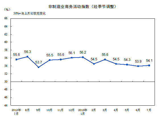 2013年7月,中國非制造業商務活動指數為54.1%,比上月小幅上升0.2個百分點。
