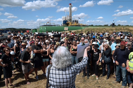 當地時間8月3日,法國民眾在巴黎市外的茹阿爾附近舉行抗議活動,反對試驗性頁巖油鉆探?棺h者稱,這一試驗打開了在巴黎盆地進行頁巖油和頁巖氣開發的大門,會造成環境污染。
