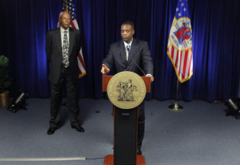 7月18日,美國底特律緊急財政管理人凱文·奧爾(右)在底特律出席新聞發布會。奧爾當天獲密歇根州州長里克·斯奈德授權,向位于底特律的美國破產法院遞交破產申請! ⌒氯A社/美聯 |