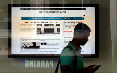 美國《華盛頓郵報》公司5日宣布,網絡購物公司亞馬遜創始人杰夫·貝索斯將以2.5億美元現金收購久負盛名但近年陷入經營困境的《華盛頓郵報》。最早創建于1877年的《華盛頓郵報》是美國最負盛名的報紙之一,曾揭露“水門事件”、“五角大樓越戰文件”等轟動全球的丑聞,“棱鏡門”事件也由該報與英國《衛報》最先披露! 圖為8月5日,一男子離開美國《華盛頓郵報》辦公大樓。