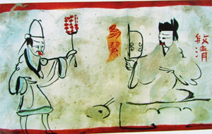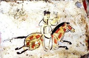 一是《驛使圖》——全國郵政的標志,出自5號墓。畫面是一個驛使騎在紅鬃馬上,頭戴進賢冠,身穿寬袖衣,足蹬長靴,左手舉木牘文書,右手持馬韁,驛騎四蹄騰空,信使則穩坐馬背飛奔傳遞。這幅驛使圖再現了當時西北邊疆驛使馳送文書的情景,被認為是我國發現最早的古代郵驛的形象資料。