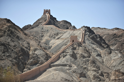 明嘉靖十八年(1539年)由肅州兵備道李涵監筑,此段長城從關城東閘門邊的角墩起向北延伸至黑山山腰,全長7.5公里。山腰長城約750米,陡峭直長,氣勢雄偉,垂若懸臂,故有“西部八達嶺”之稱。