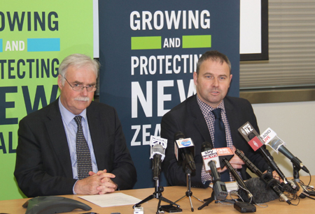 8月7日,新西蘭初級產業部負責食品安全事務的代理局長斯科特·加拉赫(右)在新聞吹風會上表示,雖然目前仍然無法排除嬰兒因服用遭污染的配方奶粉而患病的可能性,但新西蘭境內已經追溯到所有未銷售的可能遭污染的嬰幼兒配方奶粉。