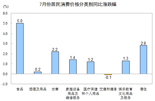 7月份,食品價格同比上漲5.0%,影響居民消費價格總水平同比上漲約1.61個百分點。其中,肉禽及其制品價格上漲5.9%,影響居民消費價格總水平上漲約0.42個百分點(豬肉價格上漲3.0%,影響居民消費價格總水平上漲約0.09個百分點);鮮菜價格上漲11.8%,影響居民消費價格總水平上漲約0.32個百分點;糧食價格上漲5.1%,影響居民消費價格總水平上漲約0.15個百分點;鮮果價格上漲7.3%,影響居民消費價格總水平上漲約0.14個百分點;水產品價格上漲3.1%,影響居民消費價格總水平上漲約0.08個百分點。